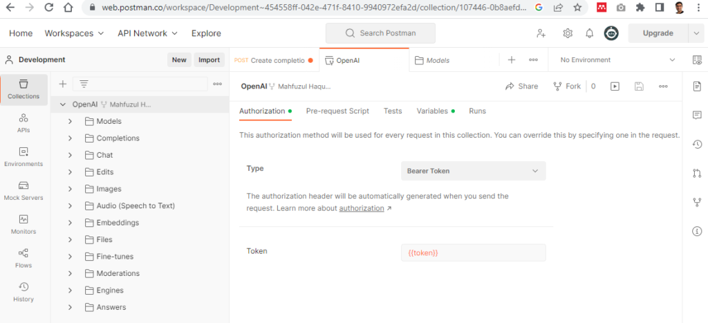 Step 4. Return to your own forked Postman workspace. Select the root item OpenAI on the left navigation tree. Under the Variables tab populate your API key for the token variable. Under the Authorization tab select Bearer Token for Type and enter {{token}} for the Token field.