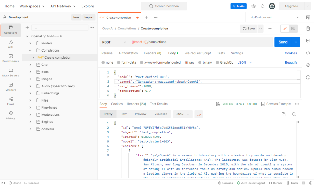 Step 1. OpenAI already provides a Postman collection for interacting with the APIs. Let’s navigate to that: https://www.postman.com/devrel/workspace/openai.
